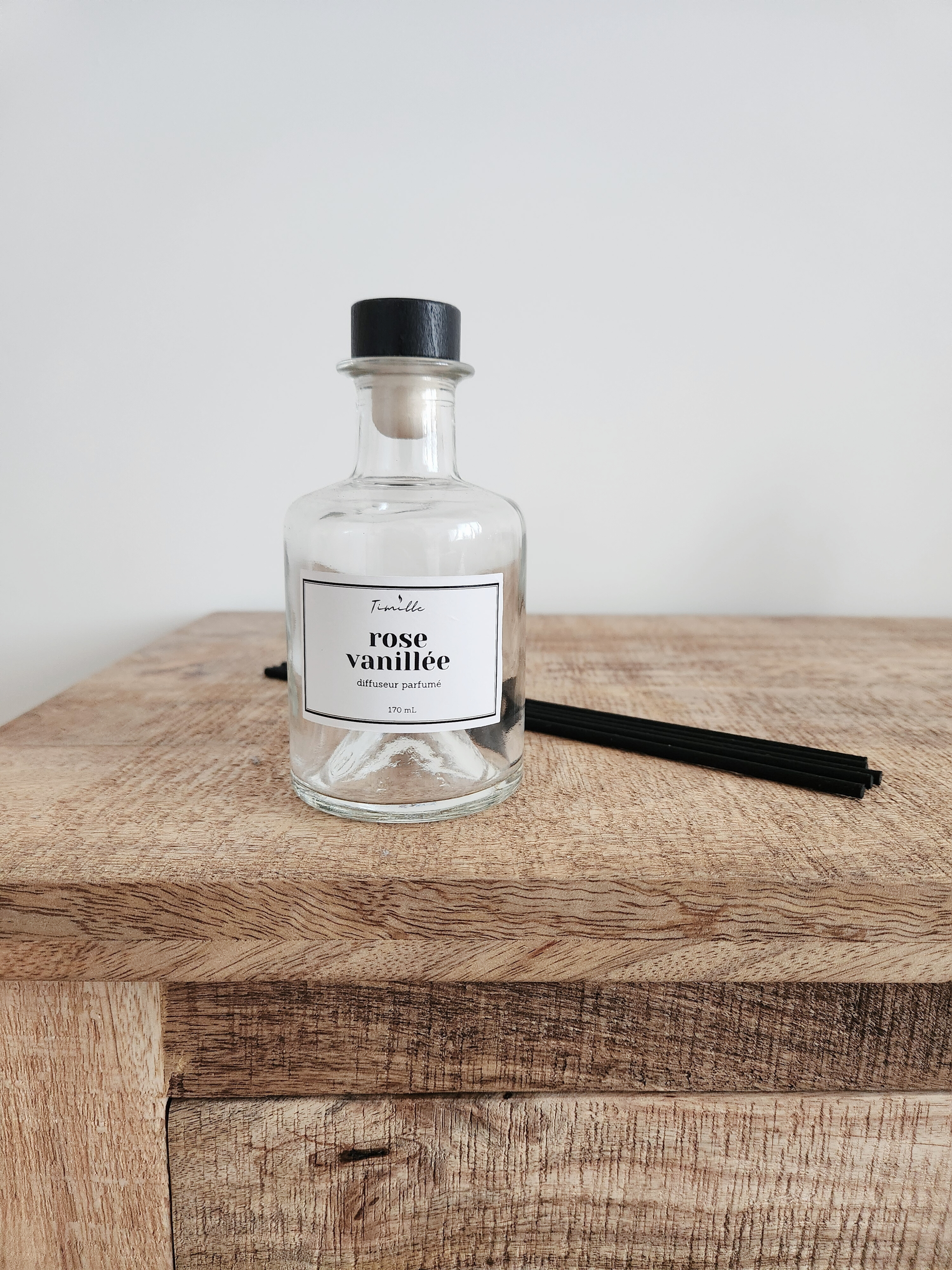 Diffuseur parfumé à bâtons, dans un flacon apothicaire en verre et bouchon noir en bois
